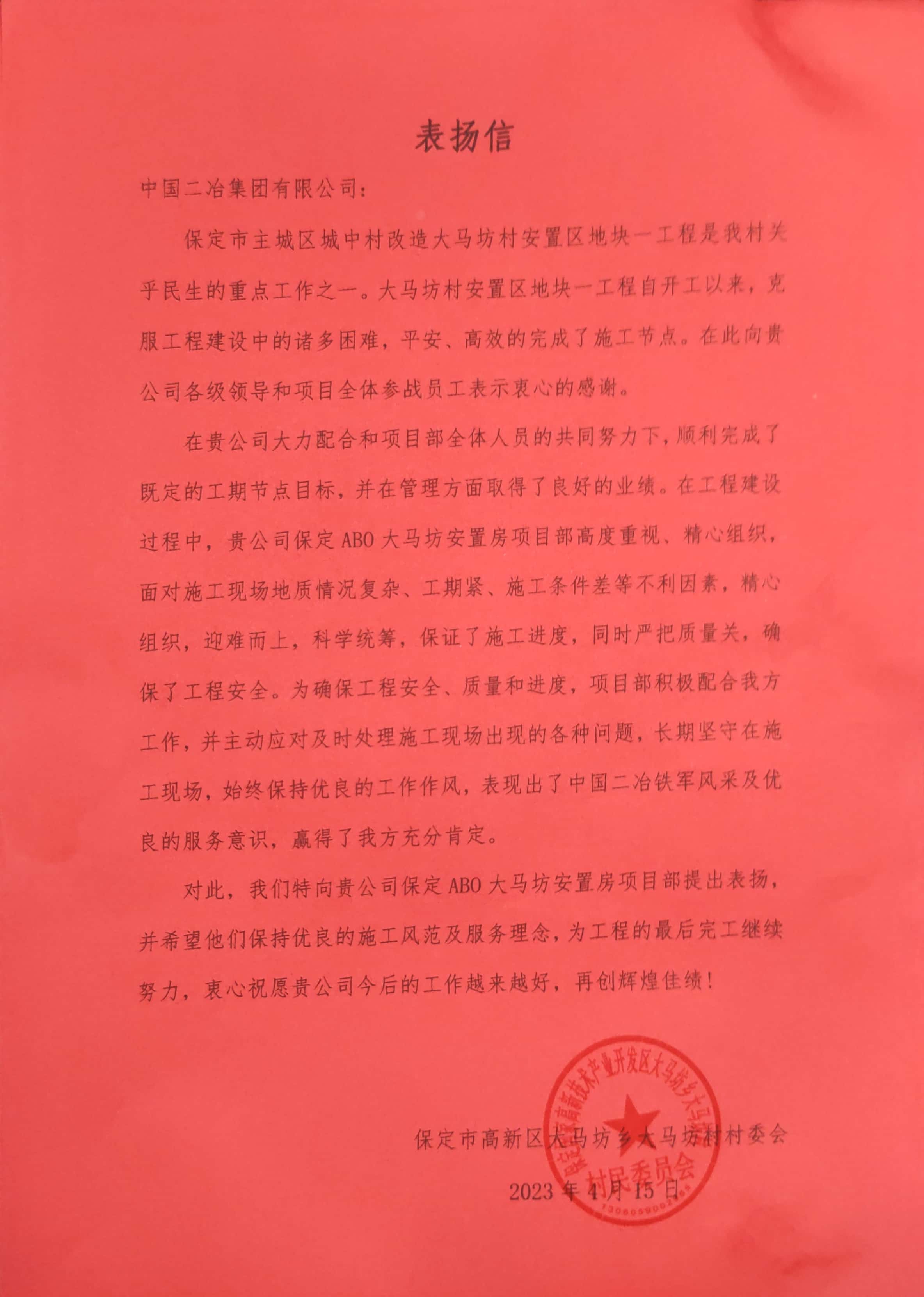 近日,中國二冶房地產公司承建的保定ABO二期大馬坊項目部分別收到來自大馬坊村委會及大馬坊鄉政府的兩封表揚信。