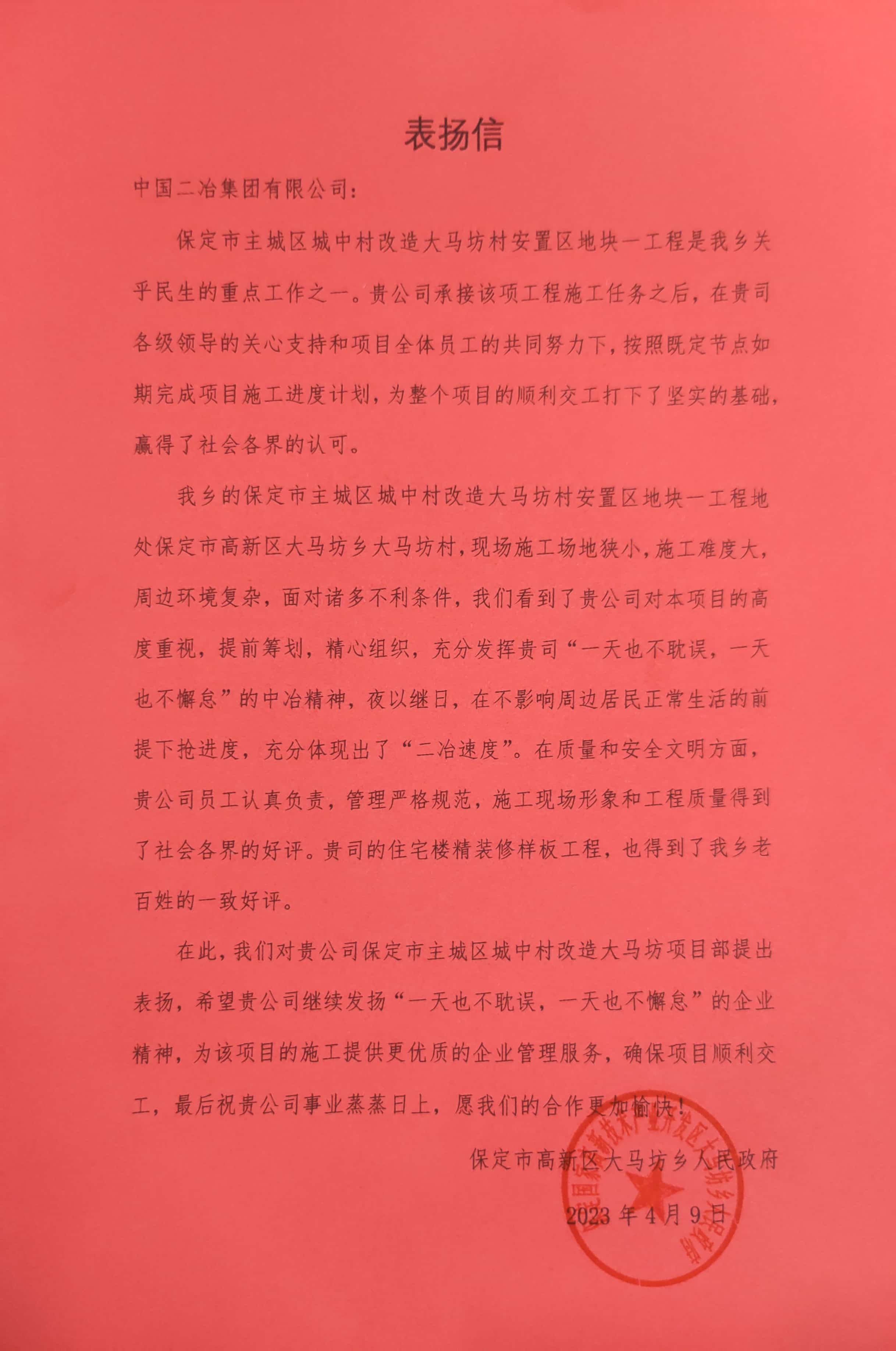 信中寫道,對中國二冶保定ABO二期大馬坊項目部全體員工充分發揮“一天也不耽誤,一天也不懈怠”的企業精神,夜以繼日搶抓工期的施工現場體現出的“二冶速度”表示高度贊揚。該項目部為切實保證工期,克服了重重困難,精心組織、迎難而上,保證了施工進度,同時嚴把質量關,確保工程安全有序推進。同時,信中表示大馬坊鄉老百姓對該項目部在近期組織的精裝修樣板工程觀摩活動,給予了一致好評。