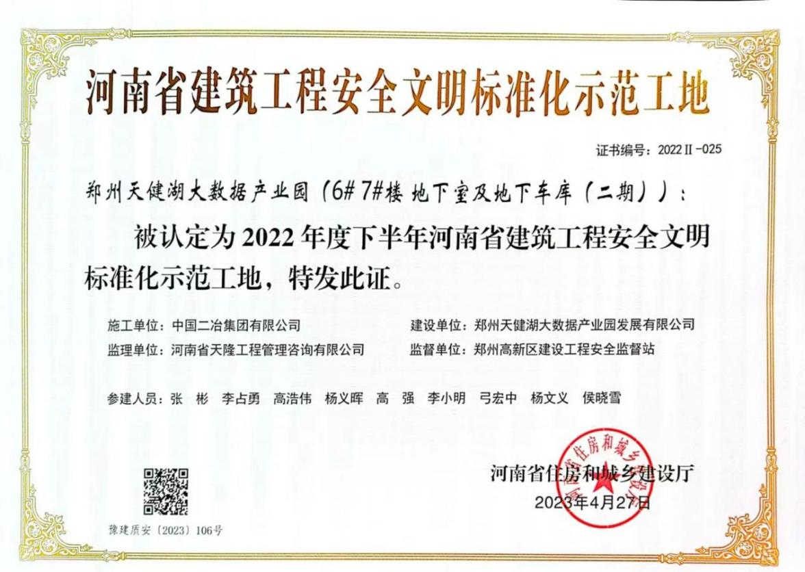 中國二冶天健湖項目獲評“河南省安全文明標準化示范工地”稱號