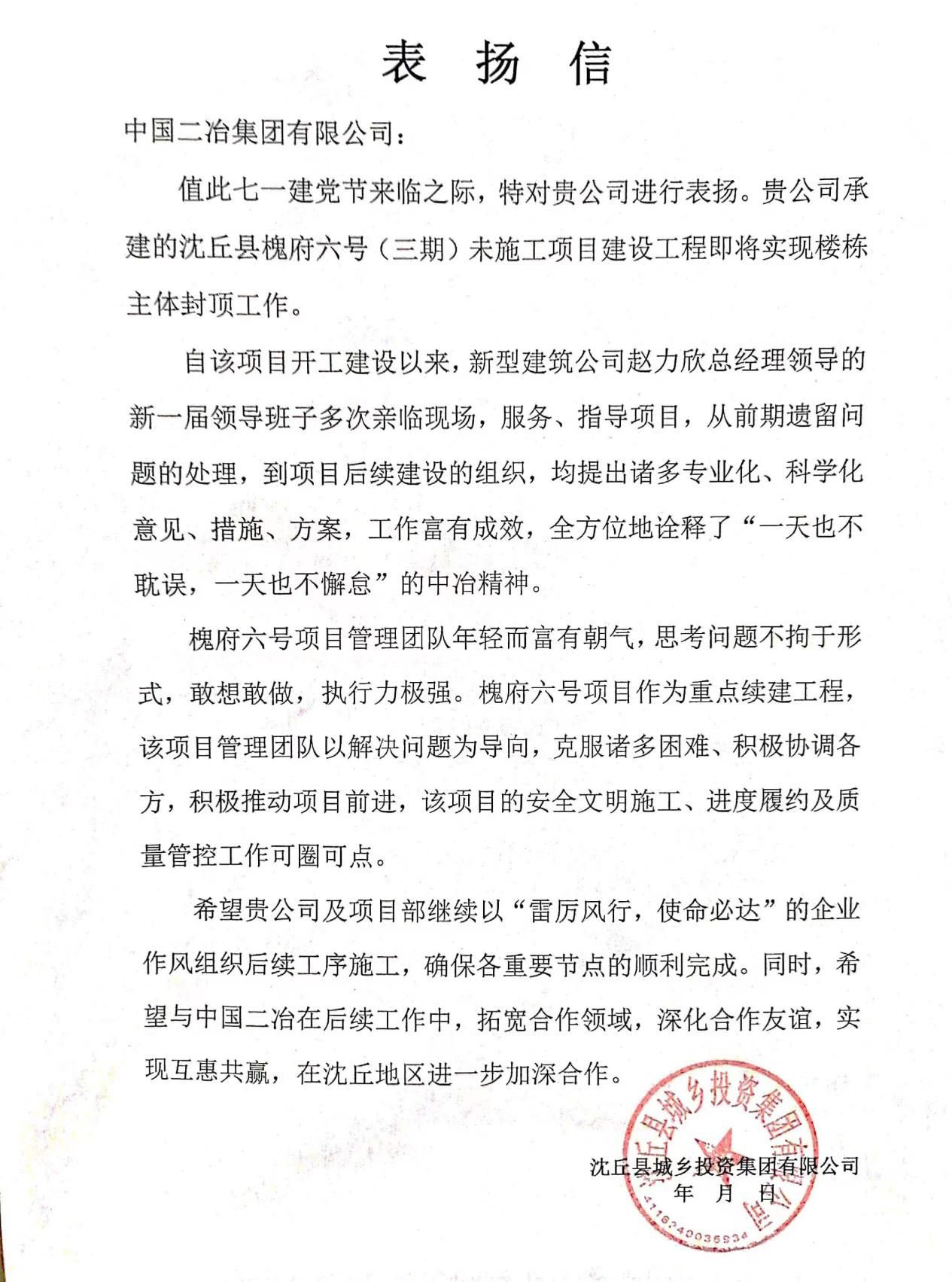 中國二冶收到沈丘縣城鄉投資集團有限公司表揚信