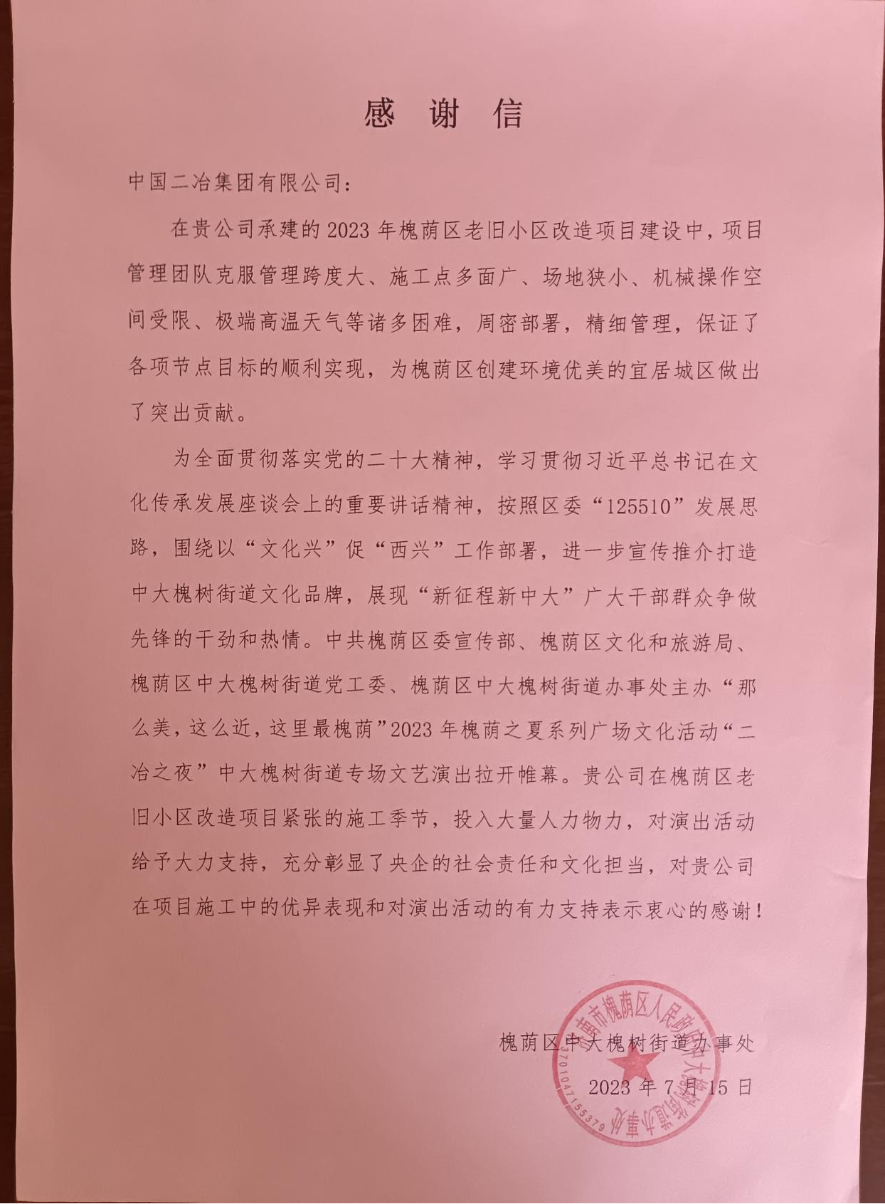 槐蔭中大槐樹街道感謝信中指出,自槐蔭老舊小區項目開工以來面對工期緊張、施工條件復雜等諸多不利因素,項目管理團隊克服管理跨度大、施工點多面廣、場地狹小、機械操作空間受限、極端高溫天氣等諸多困難,周密部署,精細管理,保證了各項節點目標的順利實現,極大的加快了施工進度,充分體現了央企的責任心和服務意識。信中表示,中國二冶在緊張的項目施工中,投入大量人力物力,對 2023 年槐蔭之夏系列廣場文化活動“二冶之夜”中大槐樹街道專場文藝演出活動給予了大力支持,充分彰顯了央企的文化擔當。