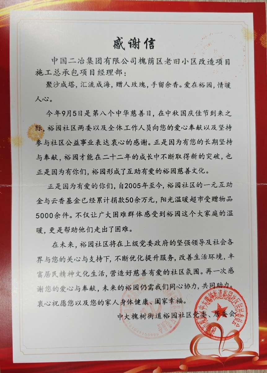 裕園社區黨委、居委會感謝信中表示中國二冶積極投身慈善公益事業,充分展現了央企的社會責任擔當,裕園社區黨委、居委會向中國二冶的愛心奉獻以及堅持參與社區公益事業表達衷心的感謝。