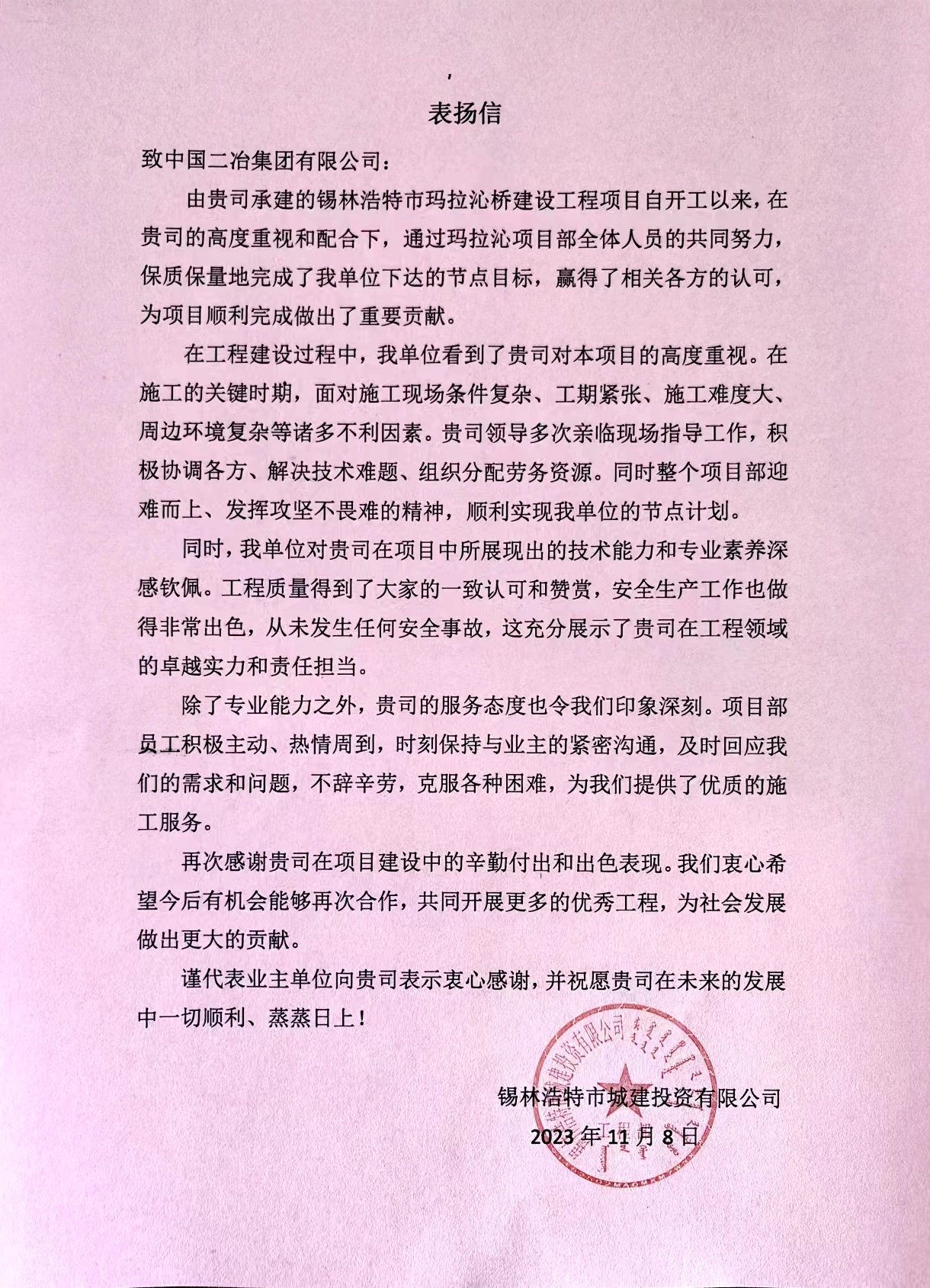 11月8日,中國(guó)二冶承建的錫林浩特市瑪拉沁橋建設(shè)工程收到錫林浩特城建投資有限公司表?yè)P(yáng)信。