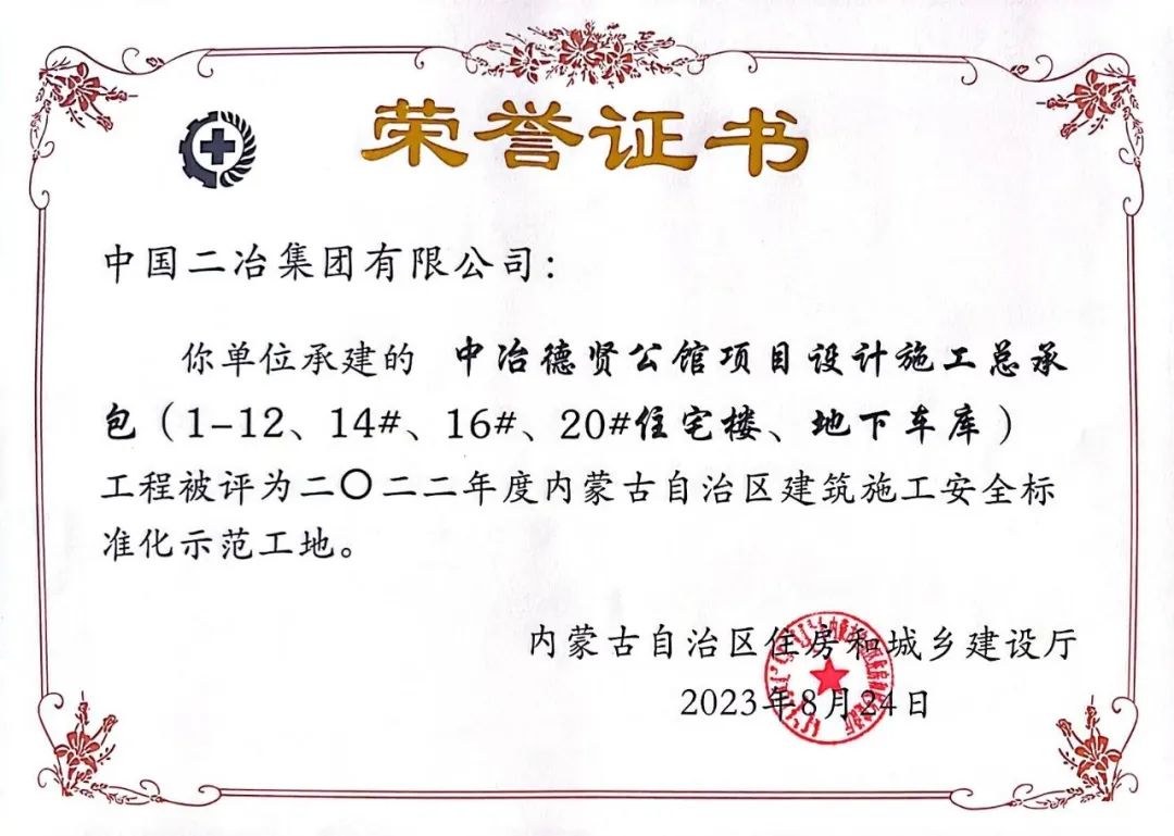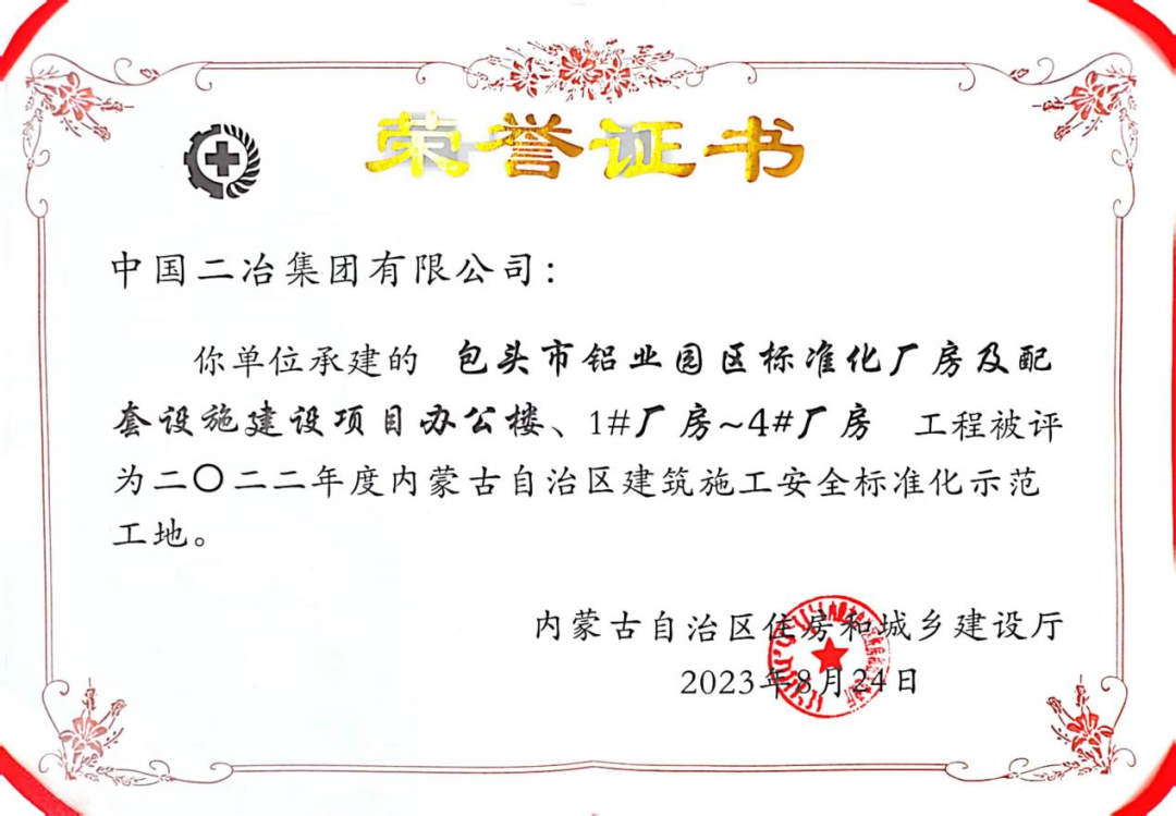 11月13日,中國二冶收到內蒙古自治區住房和城鄉建設廳榮譽證書,中國二冶中冶德賢公館項目、包頭市鋁業園區標準化廠房及配套基礎設施建設項目榮獲“2022年度內蒙古自治區建筑施工安全標準化示范工地”榮譽稱號。