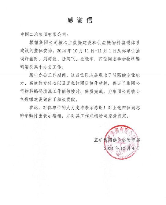 信中指出,根據集團公司核心主數據建設和供應鏈物料編碼體系建設的整體安排,2024年10月11日-11月1日從你單位抽調許鑫財、劉海波、任高飛、金曉宇,四位同志參加物料編碼清洗集中辦公工作。集中辦公工作期間,這四位同志展現出了較強的專業能力、高度的責任心以及無私的團隊協作精神,保證了集團公司物料編碼清洗工作能夠按時、保質完成,為集團公司核心主數據建設做出了積極貢獻。