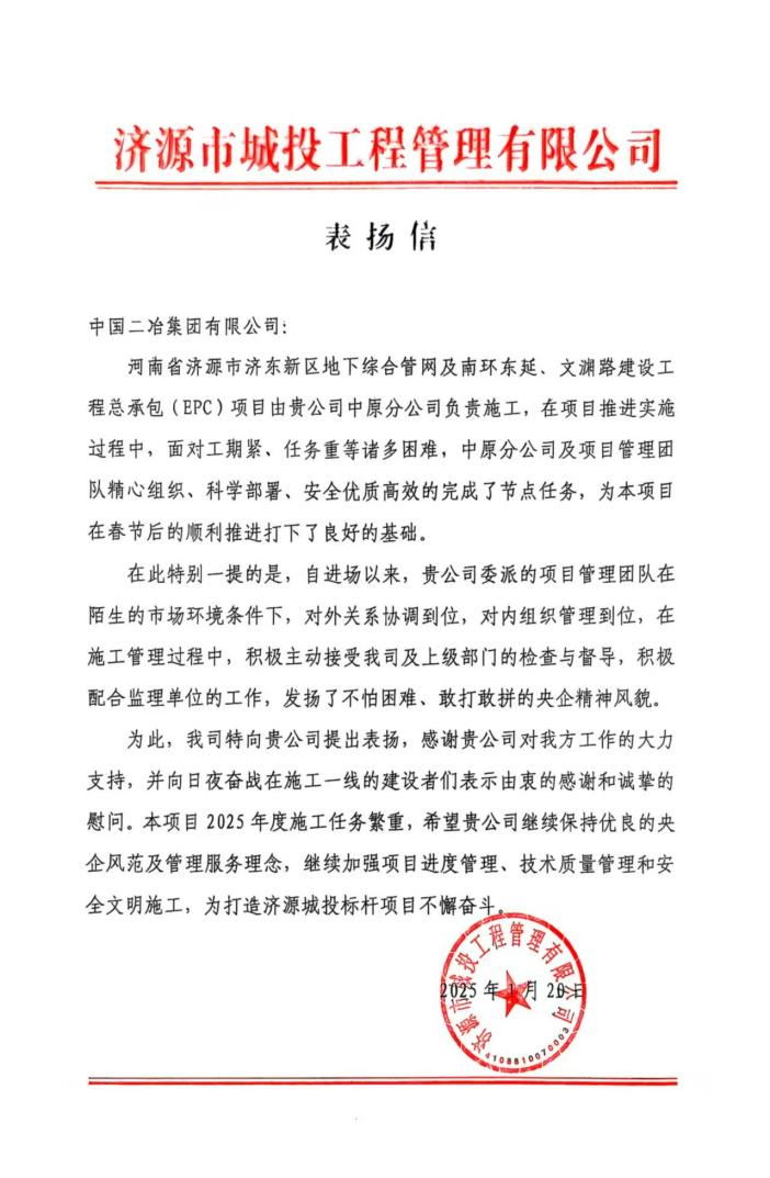 近日,中國二冶連續收到由溫縣新興產業投資集團有限公司和濟源市城投工程管理有限公司發送的表揚信,對項目管理團隊在建設過程中的突出表現表示高度贊揚。