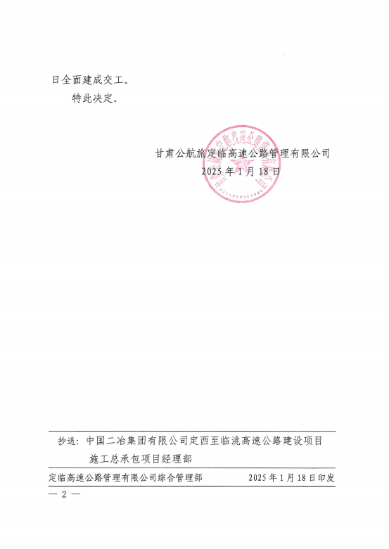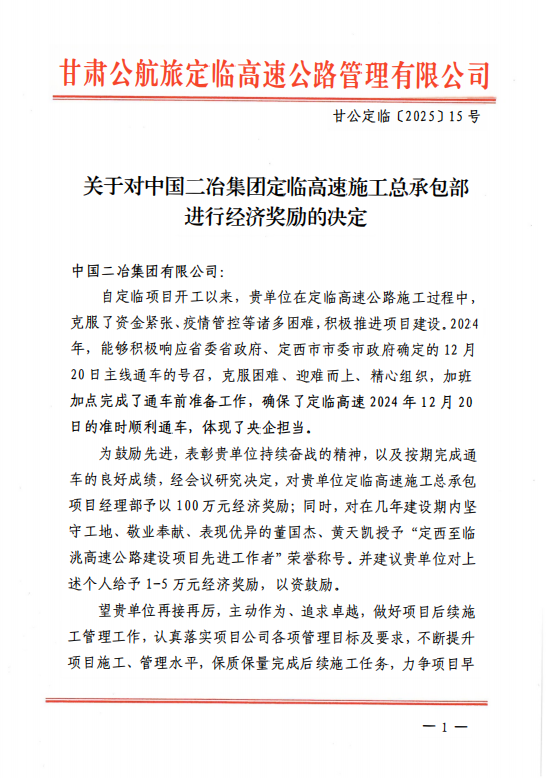 獎勵決定指出:自定臨項目開工以來,中國二冶集團項目管理團隊克服了資金緊張、疫情管控等諸多困難,積極推進項目建設。2024年,能夠積極響應省委省政府、定西市委市政府確定的12月20日主線通車的號召,克服困難、迎難而上、精心組織,加班加點完成了通車前準備工作,確保了定臨高速在2024年12月20日準時順利通車,體現(xiàn)了央企擔當。