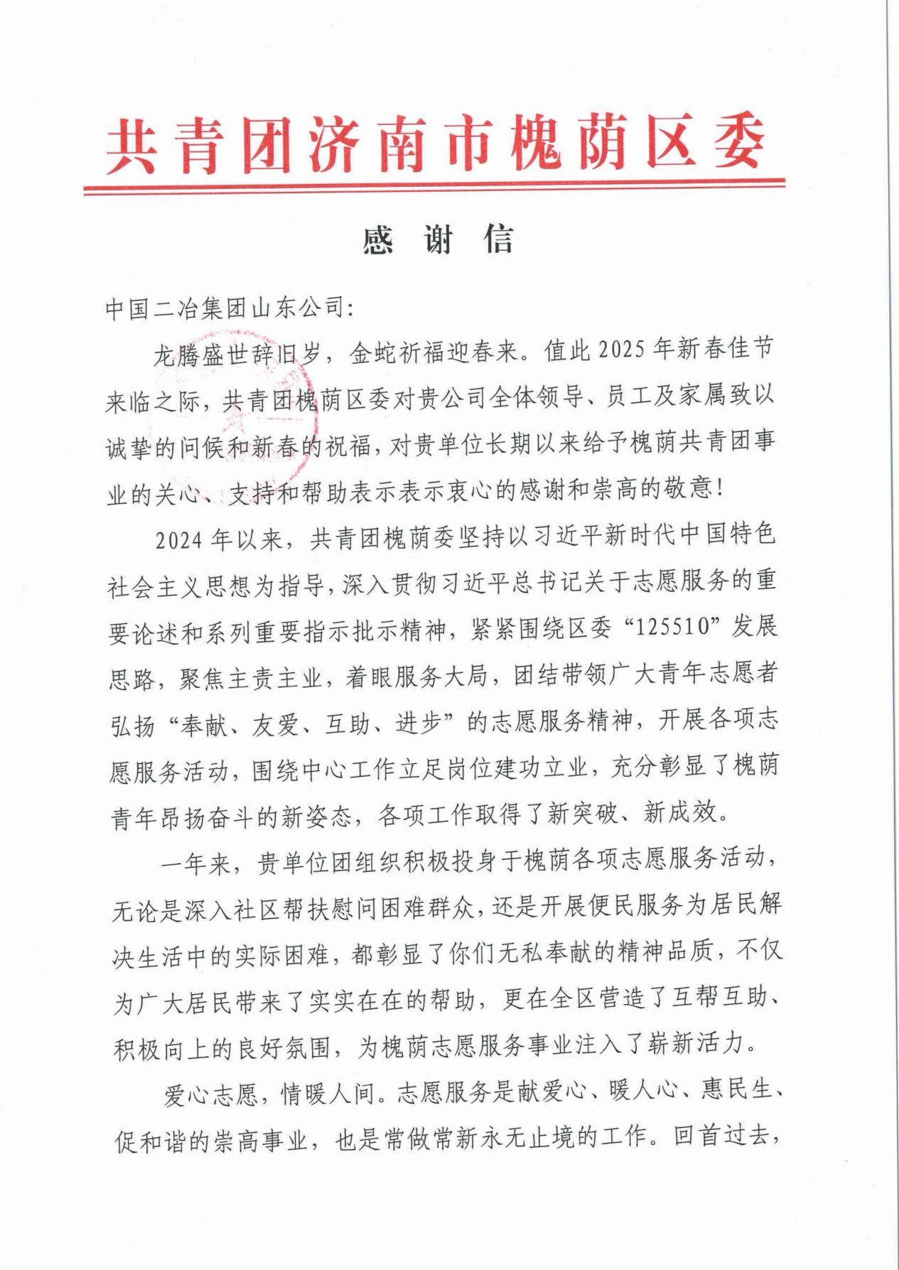 共青團濟南市槐蔭區委在信中寫道,山東公司團委積極投身于槐蔭各項志愿服務活動,無論是深入社區幫扶慰問困難群眾,還是開展便民服務為居民解決生活中的實際困難,彰顯了無私奉獻的精神品質,為廣大居民帶來了實實在在的幫助,更在槐蔭區營造了互幫互助、積極向上的良好氛圍,為槐蔭志愿服務事業注入了嶄新活力。