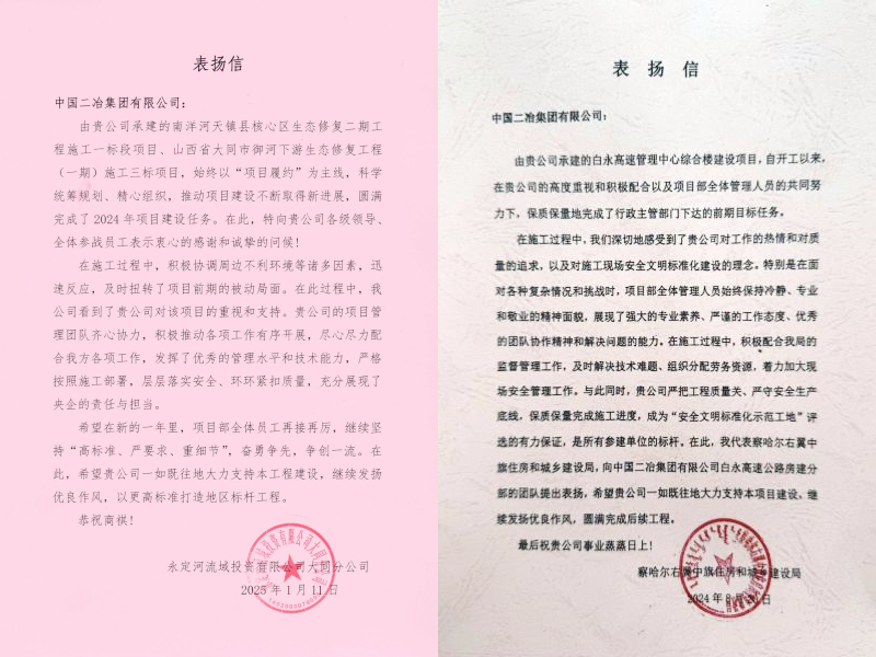 近日,中國二冶先后收到永定河流域投資有限公司大同分公司、中鹽內蒙古化工股份有限公司鹽堿分公司發來的表揚信。信中高度贊揚了中國二冶在南洋河御河項目、中鹽內蒙古化工項目建設中展現出的卓越專業能力、嚴謹施工態度以及為地方經濟社會發展作出的積極貢獻。