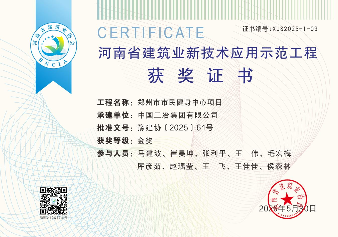 6月4日,中國二冶承建的鄭州市市民健身中心項目榮獲2025年“河南省建筑業新技術應用示范工程”榮譽稱號。