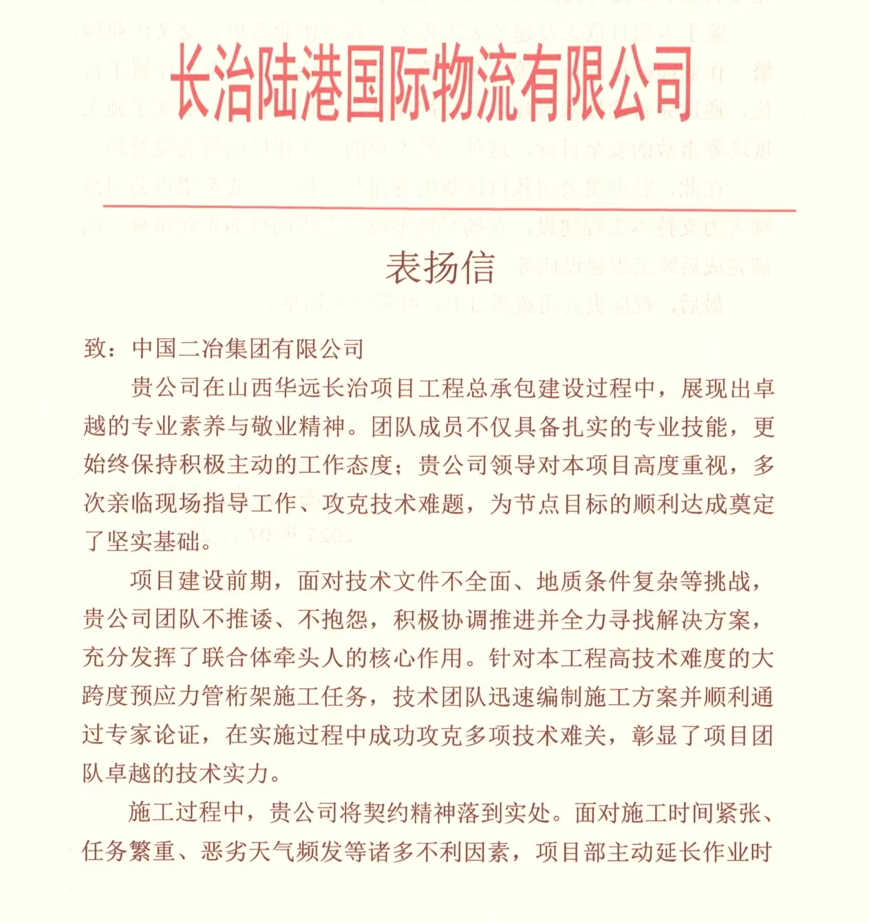 7月23日,中國(guó)二冶收到來自長(zhǎng)治陸港國(guó)際物流有限公司表揚(yáng)信。對(duì)中國(guó)二冶鋼構(gòu)公司山西長(zhǎng)治項(xiàng)目管理團(tuán)隊(duì)攻堅(jiān)克難,順利實(shí)現(xiàn)項(xiàng)目既定目標(biāo)提出表揚(yáng)。
