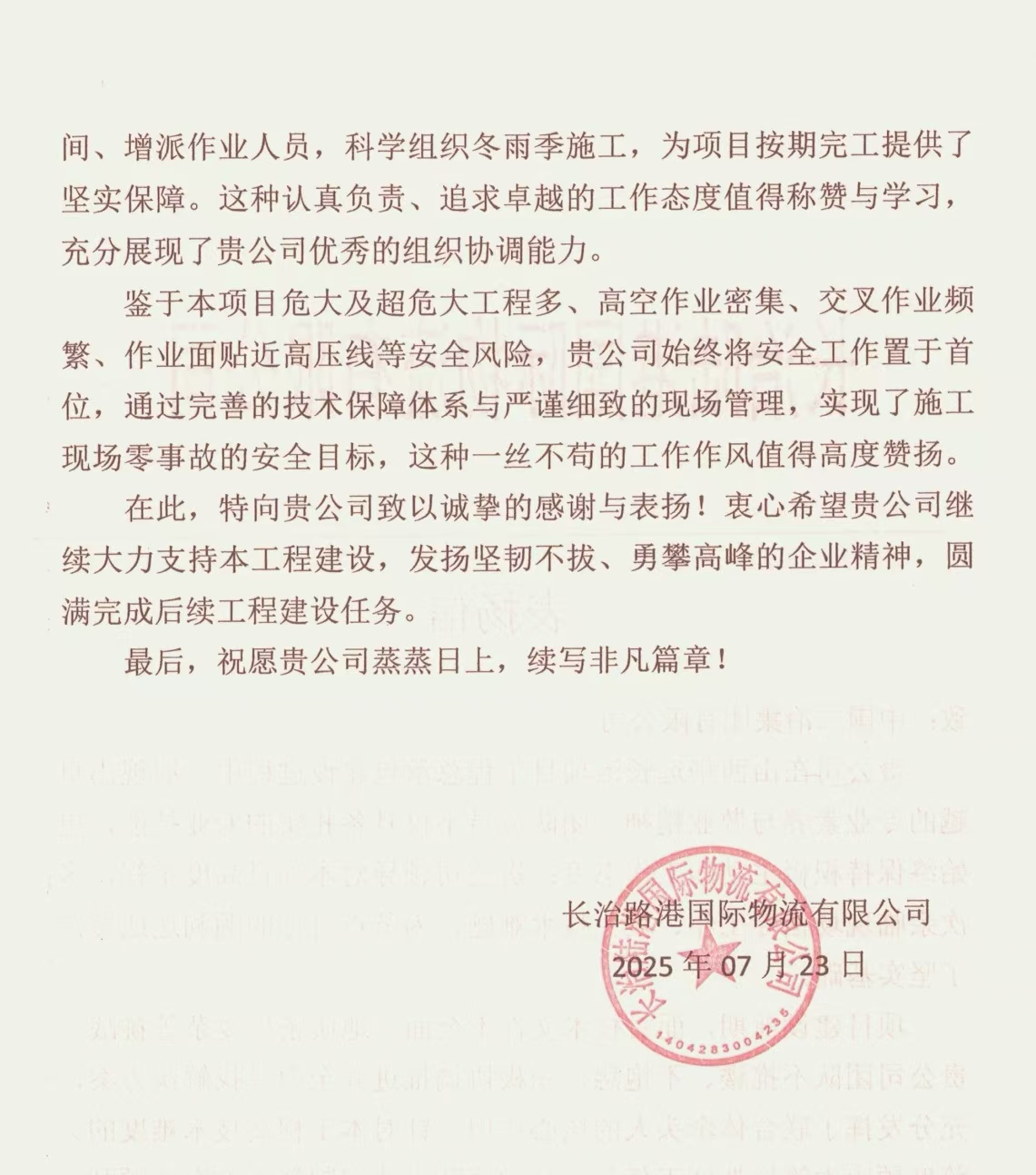 信中指出,工程自進(jìn)場(chǎng)施工以來,貴公司領(lǐng)導(dǎo)對(duì)本項(xiàng)目高度重視,多次親臨現(xiàn)場(chǎng)指導(dǎo)工作、攻克技術(shù)難題,為節(jié)點(diǎn)目標(biāo)的順利達(dá)成奠定了堅(jiān)實(shí)基礎(chǔ)。在實(shí)施過程中,項(xiàng)目管理團(tuán)隊(duì)攻克多項(xiàng)技術(shù)難關(guān),保質(zhì)保量按照計(jì)劃實(shí)現(xiàn)了預(yù)期目標(biāo),彰顯了項(xiàng)目團(tuán)隊(duì)卓越的技術(shù)實(shí)力。特別是施工關(guān)鍵時(shí)期,由于本項(xiàng)目存在危大及超危大工程多,高空作業(yè)密集,交叉作業(yè)頻繁等安全風(fēng)險(xiǎn),為此,項(xiàng)目管理團(tuán)隊(duì)始終將安全工作置于首位,通過完善的技術(shù)保障體系與嚴(yán)謹(jǐn)細(xì)致的現(xiàn)場(chǎng)管理,實(shí)現(xiàn)了施工現(xiàn)場(chǎng)零事故的安全目標(biāo)。